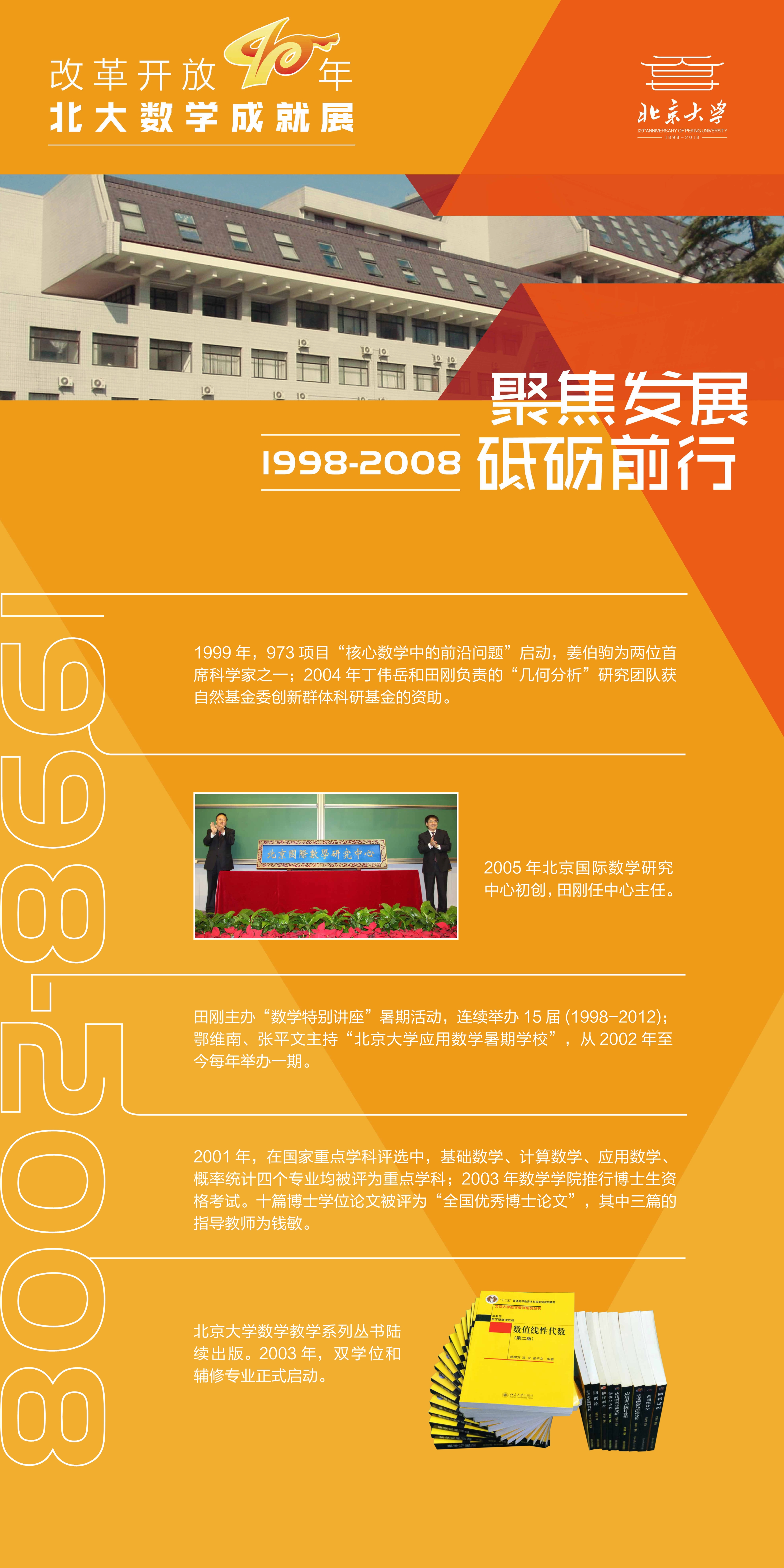 雄关漫道真如铁,而今迈步从头越。作为国内数学学科的排头兵,我们将不懈努力,创造一流工作条件,吸引海内外杰出数学家和优秀学生,在若干研究领域做出开创性的成果,在更多领域达到世界领先水平,解决一批国家重大项目中的数学问题,造就一大批数学家和国家建设栋梁之材,使北大早日成为数学/统计学研究和人才培养的世界中心之一,助力我国从数学大国上升为数学强国.新征途上,我们希望继续得到同行校友和所有关心北大数学的朋友们一如既往的爱护和支持!