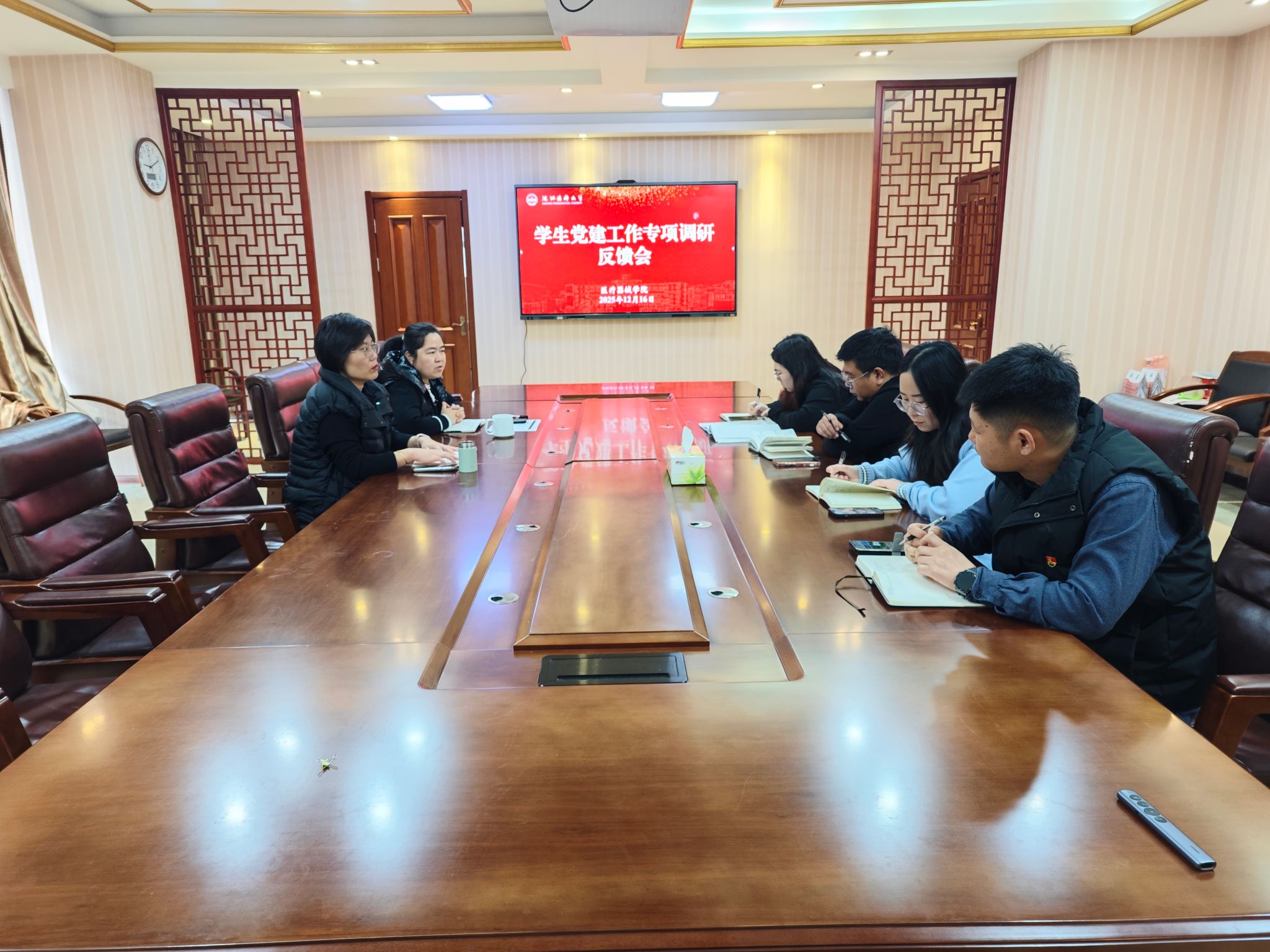 12月16日上午,学院在学院4楼小会议室召开2025年学生党建工作专项调研反馈会议。学院党委书记孙皎皎、副书记易庆艳、团委书记刘思嘉、组织员及学生党建工作相关负责人参会,会议由易庆艳主持。