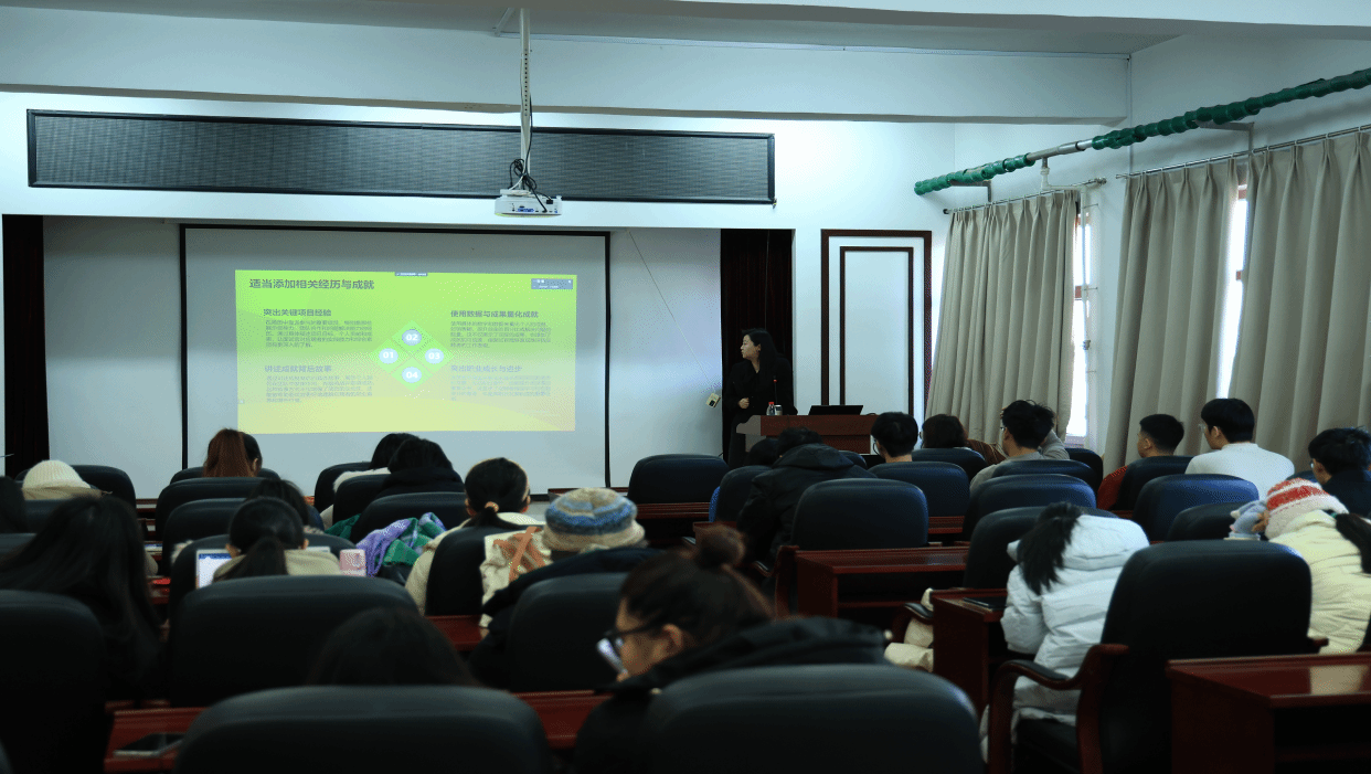 在讲座中,李楠凭借自身丰富的人力资源管理经验,深入浅出地为学生们解析了简历优化、面试技巧、面试后续跟进以及应对面试中常见问题的实用方法。她强调了在简历中突出关键项目经验、使用数据和成果量化成就的重要性,并分享了如何讲述成就背后的故事,以及如何突出职业成长与进步。