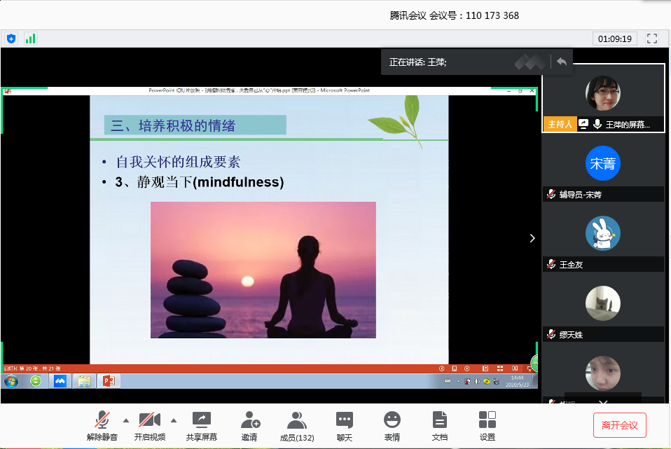 王萍以“拥抱积极情绪,关爱自己从“心”开始”为题,结合当前疫情时期学生居家学习的实际情况,深入浅出的向同学们讲解认识危机,疫情下应激反应及调试,以及如何培养积极的情绪。通过举例的方式为同学们详细讲解每一部分的内容,同学们学习到要懂得感恩、学会自我关怀,通过善待自己、共通人性,静观当下的方法科学地应对危机情绪,培养积极情绪。讲座最后王萍带着同学们做心理放松训练,跟随音乐和指令同学们身心得到放松,能够平和接纳自己的缺点及不足,纷纷表示受益匪浅。