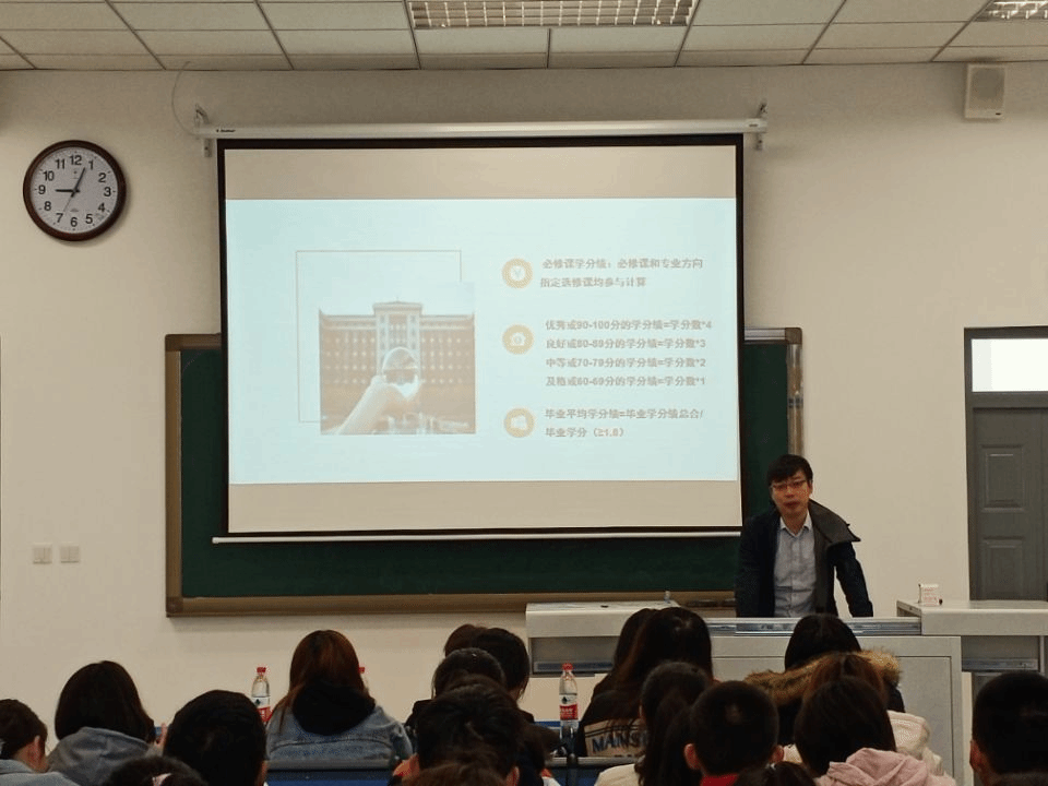 项荣武从人才培养的角度,向同学们详细介绍了学籍管理的相关规定。包括专业课程的学习、教学计划、课程选修、毕业学位证书发放等学生在校期间与学业相关的内容。从学分到选课,从留降级到保研,从考试到转专业,从学习到做人,从现在到将来,既有为师者的教育和指导,也有为父者的关怀与温情。