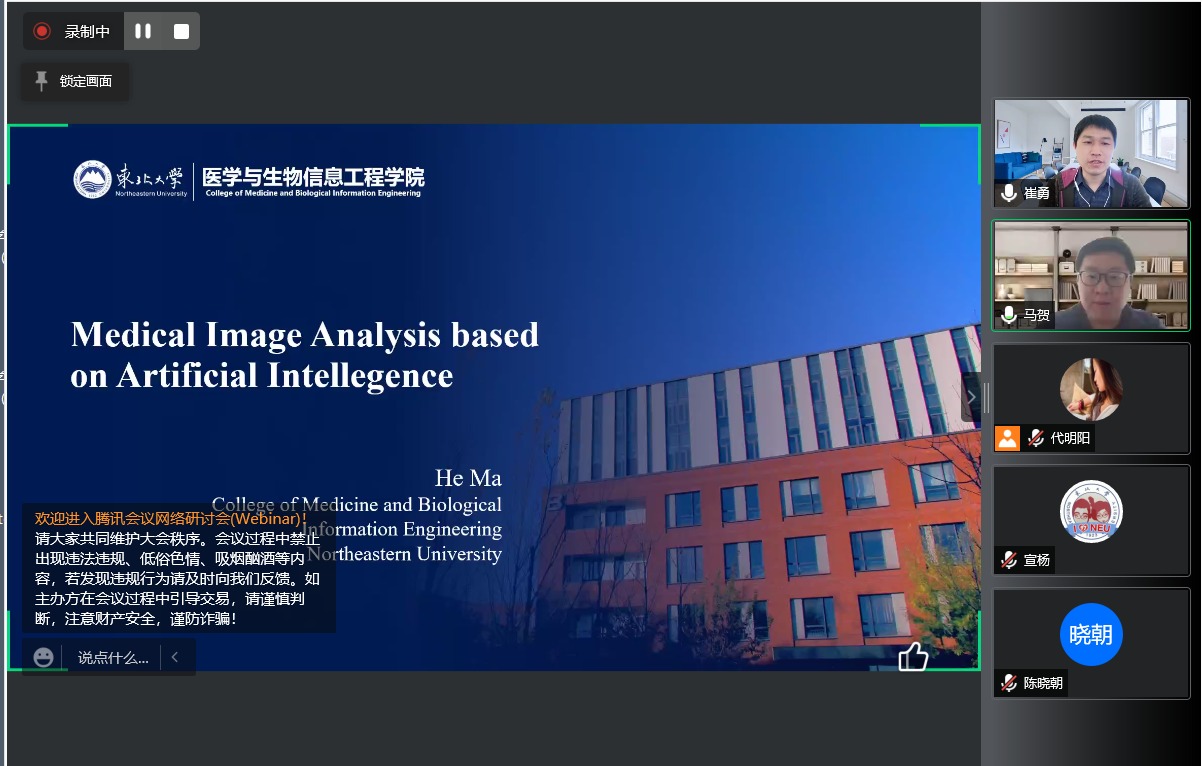 4月16日,由研究生院、辽宁省药学研究生创新与学术交流中心、beat365官方网站联合举办的“沈药无涯论坛”第289讲——马贺副教授学术报告会于线上如期举行。会议邀请到东北大学医学与生物信息工程学院副院长马贺副教授做题为《基于人工智能的医学影像数据分析》的学术报告。报告会由beat365官方网站副院长崔勇主持,100余名师生在线收看。