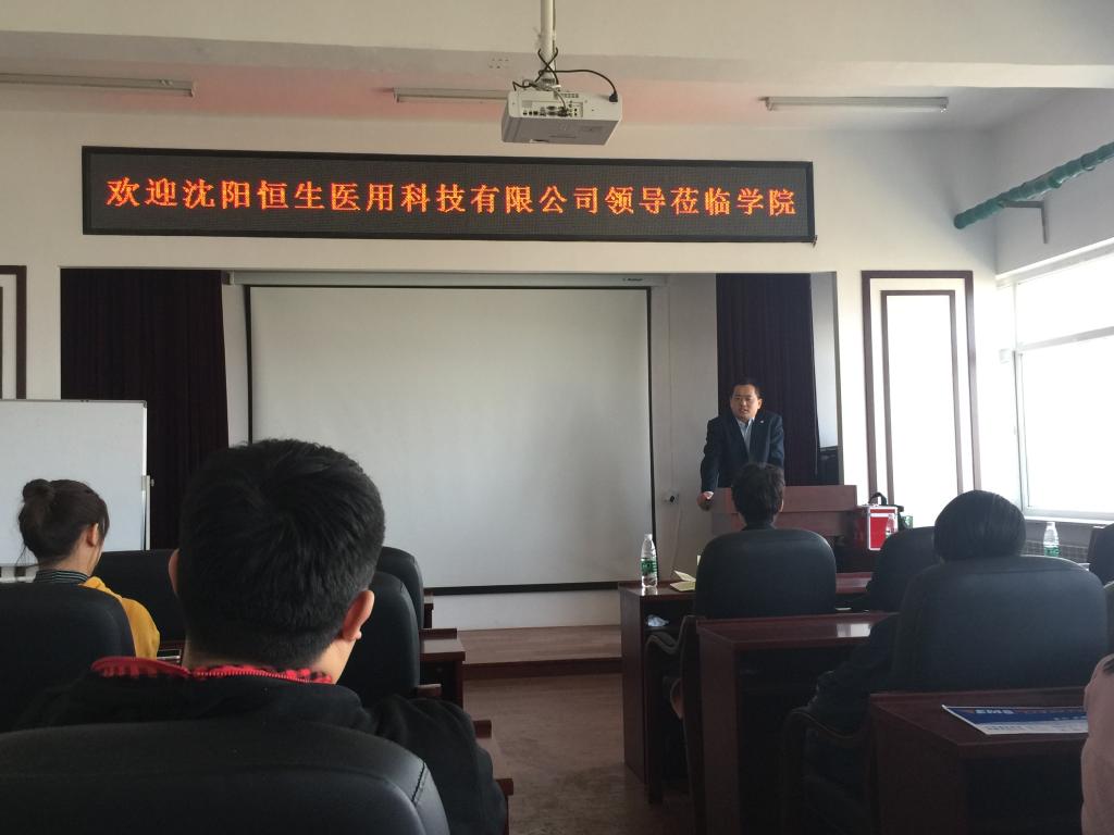 迟老师首先介绍了沈阳恒生医用科技有限公司的发展历史、总体情况、重点产品、企业文化等。并向同学们介绍了“研发”、“生产质量”、“职能综合”三大就职方向的晋升方式,完善的职业发展规划帮助同学们意识到树立长远的发展目标并为之不懈奋斗的重要性。同时,迟老师还特别强调了职工的自主学习能力,只有坚持锻炼自主学习能力,不断增加知识储备、更新专业技能才能适应当今社会瞬息万变的发展情况。随后,庞经理以迟老师的个人发展情况为缩影介绍了公司员工的发展潜力,庞经理表示选准今后的就业方向并寻求一个良好的发展平台会为自己的职业生涯带来无限的发展可能。最后,张良博士从公司科研实力等方面为大家介绍了公司的发展状况,以学长的身份为同学们讲述了选定适合自己的工作的重要性,并鼓励同学们不断充实自我,提高自己的核心竞争力。