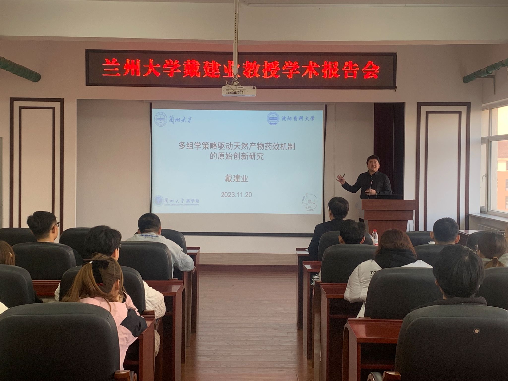 11月20日,值此学校建校92周年之际,兰州大学药学院、beat365官网72期校友戴建业教授应邀为学院师生做题为《多组学策略驱动天然产物药效机制的原始创新研究》学术报告。报告会由学院副院长项荣武主持,研究生及本科生共计近100人参会。