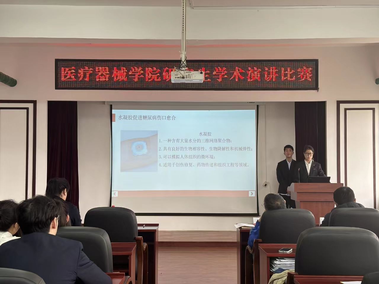 本次比赛共有六支队伍参赛,各队分别以“精准用药背景下粒子滤波器在病情预测中的应用与探究”“人工血管及血管支架覆膜的发展”“单原子催化剂及其在肿瘤治疗中的应用”“糖尿病的治疗与检测”“中医药知识图谱的构建与应用”“大语言模型在药学领域的应用与挑战:现状与未来”为题依次进行学术演讲。各队准备充分,围绕着学术研究领域进行。演讲内容充实、表达生动、形式多样、深入浅出,表演富有创新性,极具韵味和表现力。每支队伍结束后,各位评委老师进行了指导和点评,从学术规范性、演讲技巧和现场互动等方面提出建设性建议,希望参赛选手们能够精心打磨题目,同时演讲内容要结合所学专业介绍前沿研究成果。